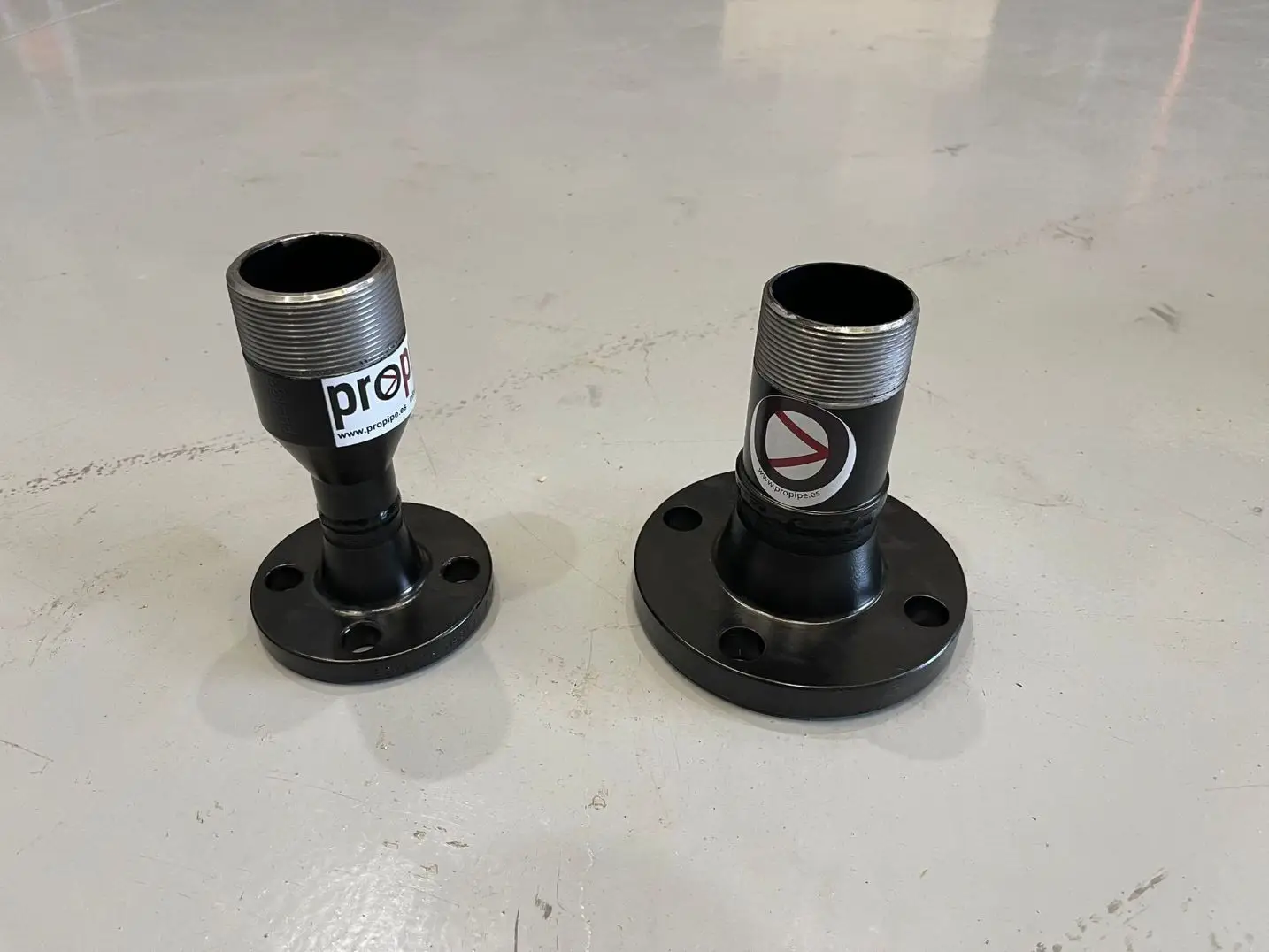 Two Black Propipe Flanged Valve Adapters With Threaded Tops And Four-Bolt Bases, Shown Side By Side. Each Features Distinct Branding And Regional Labeling, Designed For Secure Valve Integration In Industrial Pipelines.