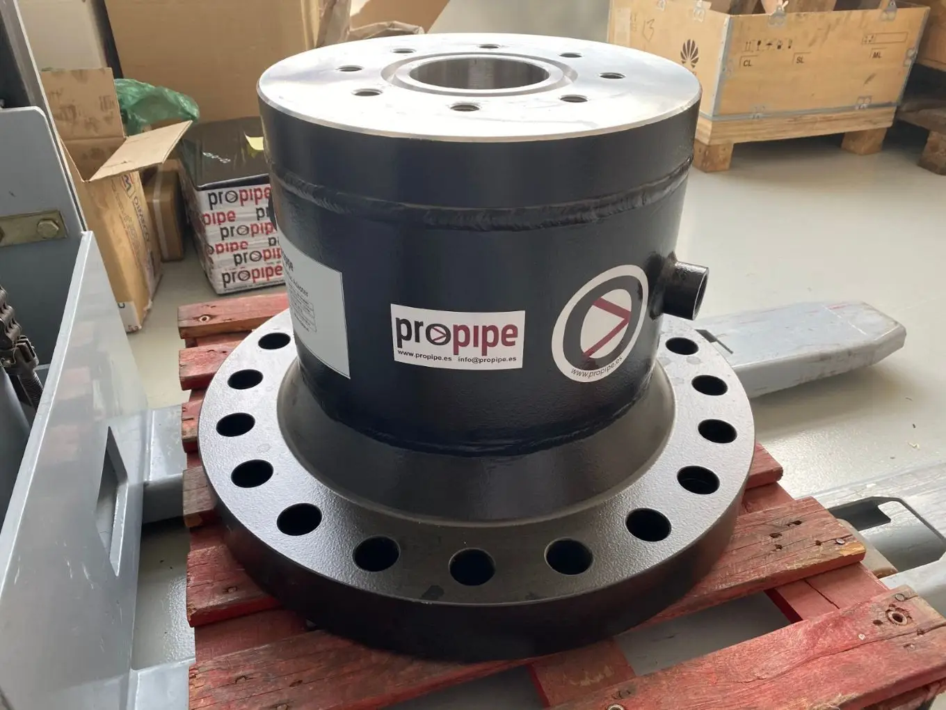 Propipe Standard 30-Inch Line Stop Housing Resting On A Wooden Pallet. The Large, Black Metallic Fitting Features A Flanged Base And Cylindrical Body, Designed For High-Pressure Pipeline Isolation During Maintenance Or Modification. Its Robust Construction Supports Secure Deployment In Industrial Line Stop Operations.