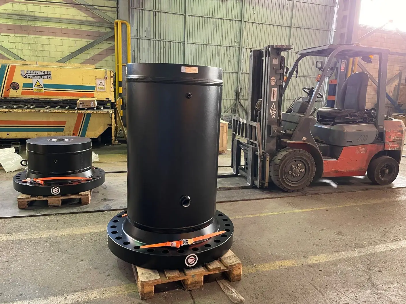 Four Black Propipe Line Stop Housings With Flanged Ends Are Displayed On A Blue Pallet In A Warehouse Setting. Two Units Feature Custom Bypass Outlets, Indicating Their Role In Maintaining Flow During Pipeline Isolation. Each Housing Has A Cylindrical Body With Perpendicular Extensions, Designed For Secure Integration Into Pressurized Systems.