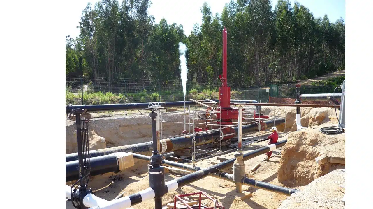 Geothermal Wellhead Installation In A Forested Area Featuring A Red Wellhead Structure Venting Steam Vertically. The System Includes Interconnected Piping, Valves, And Control Assemblies, With Visible Line Stop Equipment Designed To Isolate Flow During Maintenance Or Intervention. A Technician In Protective Gear Is Seated Near The Piping Network, Indicating Active Monitoring. The Fenced Site Is Set In Sandy Soil, Surrounded By Trees, Showcasing Remote Energy Infrastructure With Integrated Flow Control And Isolation Capabilities.