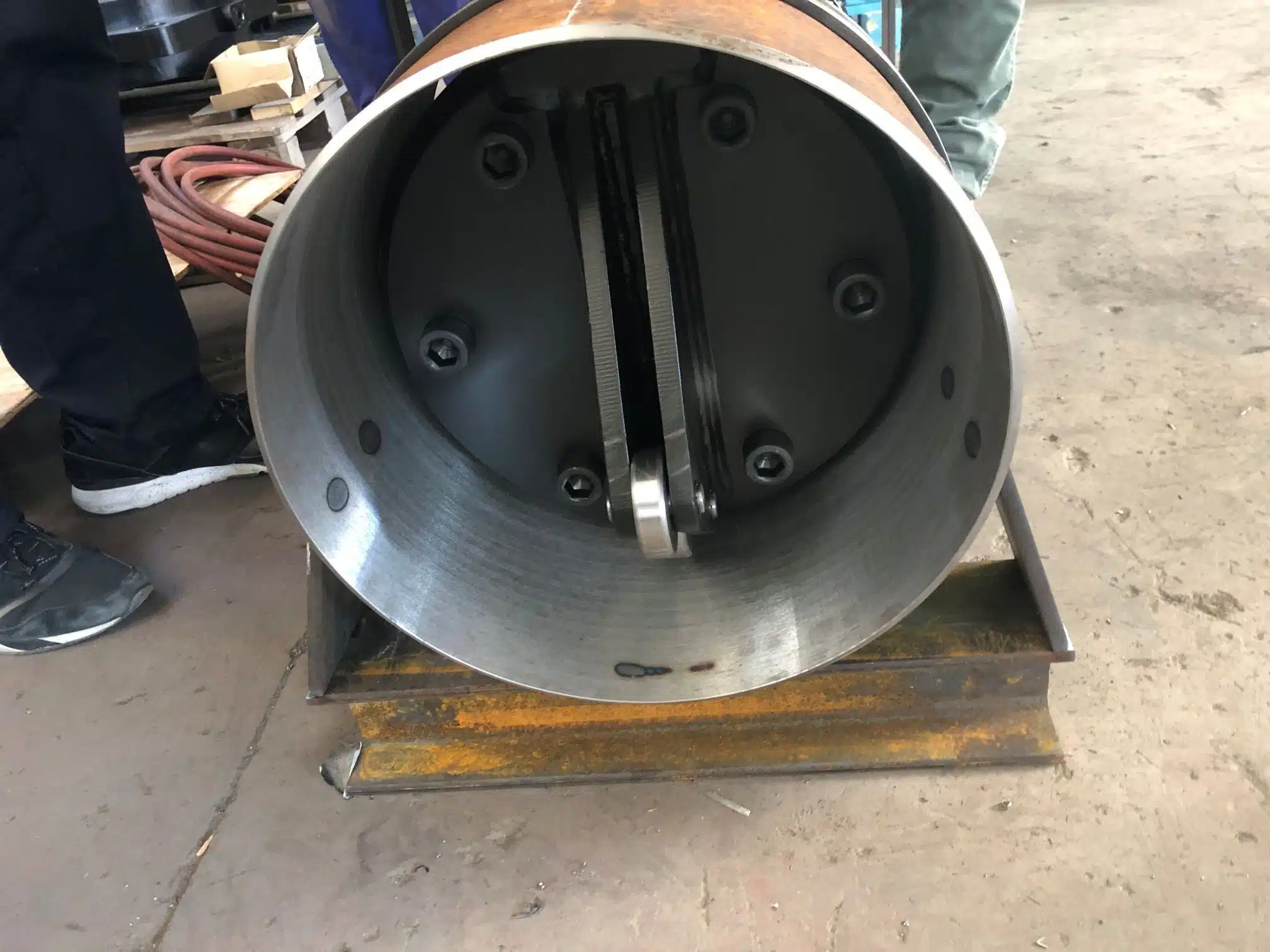 Alt Description: Interior View Of A Cylindrical Pipeline During A Test Of A Line Stop Plugging Head. The Mechanical Assembly Includes A Bolted End Plate And A Central Strap Or Arm Mechanism Designed To Deploy And Seal The Plugging Head Inside The Pipe. The Setup Rests On A Rusted Steel I-Beam In An Industrial Workshop, With Tools And Equipment Visible In The Background—Highlighting Controlled Testing Conditions For Flow Isolation Hardware.